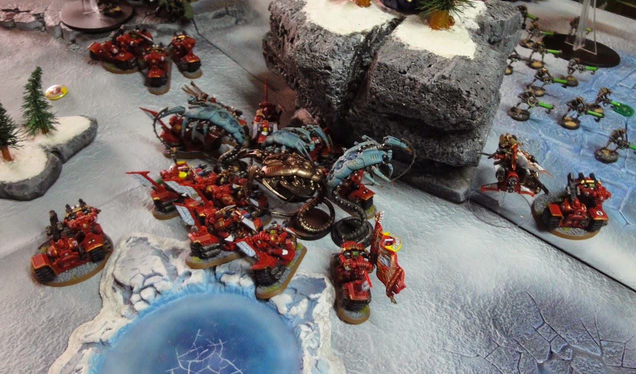 De mon coté, la horde rouge se prépare à charger, je splitte mes escouades en petits groupes de 3 (4 restent en attaque de flanc), et tout se petit monde se prépare à charger à travers la plaine glacée...